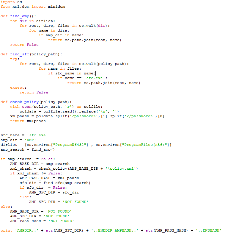 This script returns the AMP sfc.exe path and the policy.xml BASE64 Hash of the protector password. Here is a screenshot of the script: