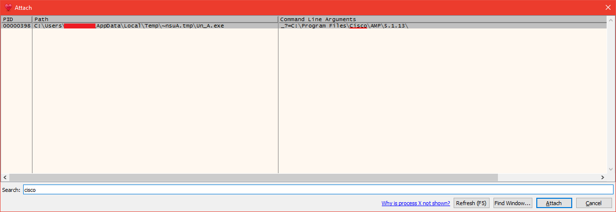 Once in x32dbg press ALT+A to attach to a process. You can use the search at the bottom to search for Cisco. Select the process Un_A.exe and click attach: