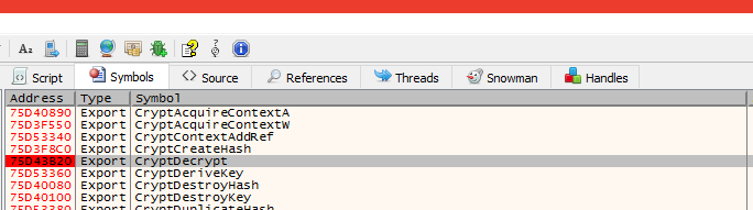 After the symbols has loaded in the right panel, locate the Export CryptDecrypt, click on it and then hit F2 to set a breakpoint at this address. The address value with turn red: