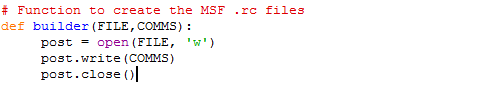 The builder() function simply takes a filename and the metasploit commands that are going to be written to a the ‘.rc’ file..