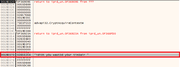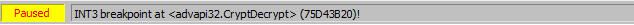 Enter any value for password and click ‘Uninstall’.  You will see x32dbg hit the breakpoint for advapi32.dll.CryptDecrypt in the lower left of the program: