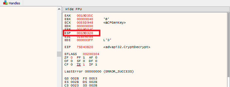 In this case the ESP value is 0019D320. All we have to do now is subtract this value by 1A0 which will give us an address of 0019D180.