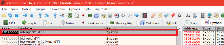 In the left panel of the Symbols tab, click on advapi32.dll: