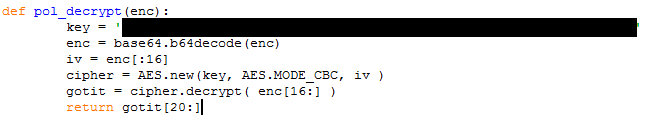 Just pass the BASE64 password value to the above via pol_decrypt(base64 hash) and it will return the password. Interestingly enough, the iv is the first 16 of the policy.xml UUID. You also may want to strip non printable characters